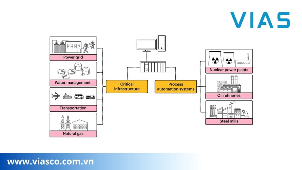 Ví dụ về nơi các hệ thống điều khiển công nghiệp được sử dụng trong cơ sở hạ tầng quan trọng bao gồm lưới điện, quản lý nước và nước thải, giao thông vận tải và khí đốt tự nhiên.
